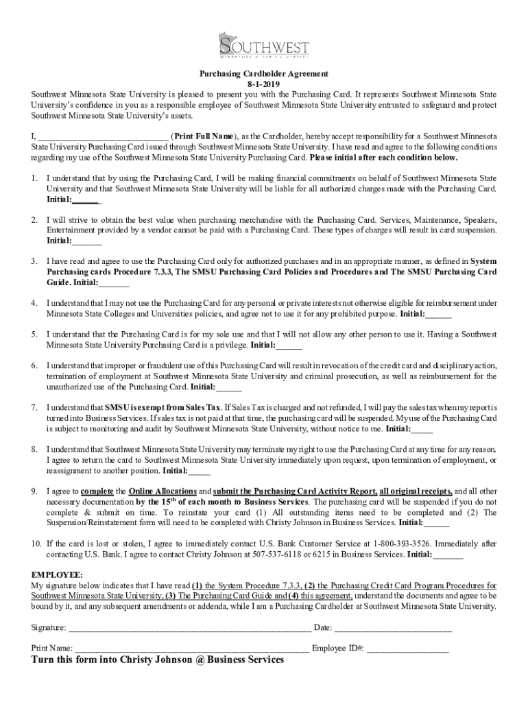 Purchasing Cardholder Agreement 812019 Southwest Minnesota State University is pleased to present you with the Purchasing Card. It represents Southwest Minnesota State Universities confidence in you