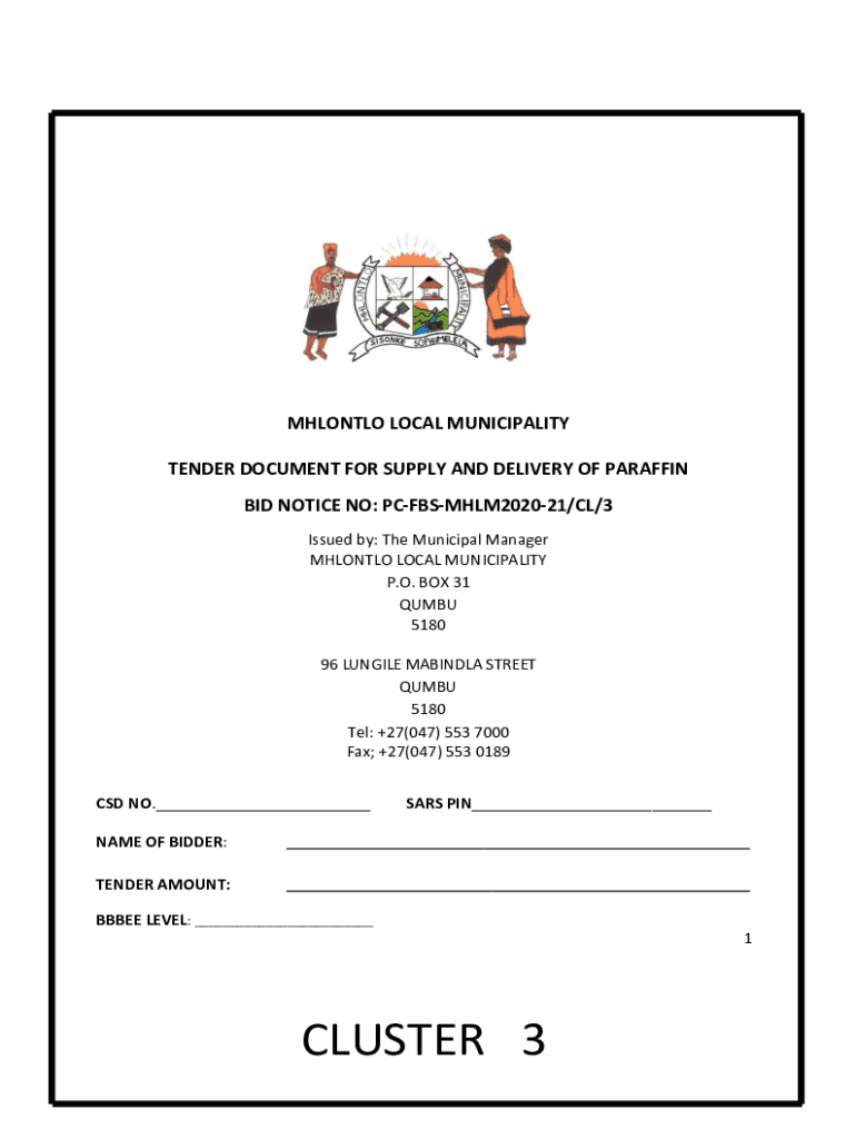 MHLONTLO LOCAL MUNICIPALITY TENDER DOCUMENT FOR SUPPLY AND DELIVERY OF PARAFFIN BID NOTICE NO: PCFBSMHLM202021/CL/3 Issued by: The Municipal Manager MHLONTLO LOCAL MUNICIPALITY P.O. BOX 31 DUMB 5180