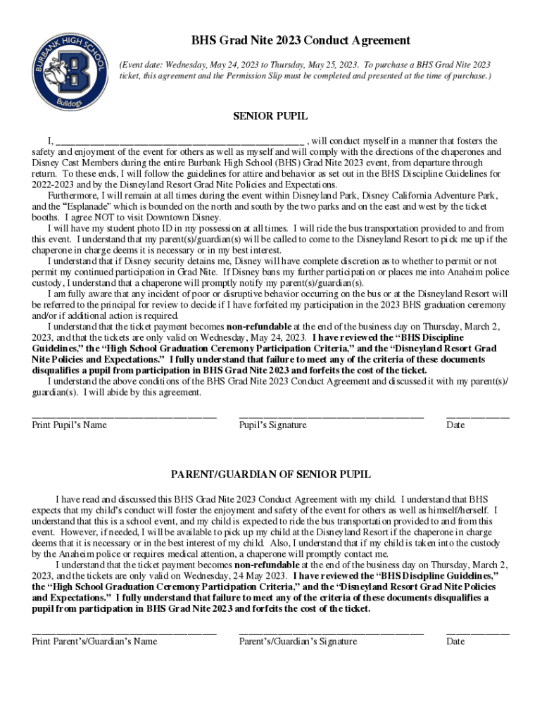 BHS Grad Nice 2023 Conduct Agreement (Event date: Wednesday, May 24, 2023, to Thursday, May 25, 2023. To purchase a BHS Grad Nice 2023 ticket, this agreement and the Permission Slip must be completed