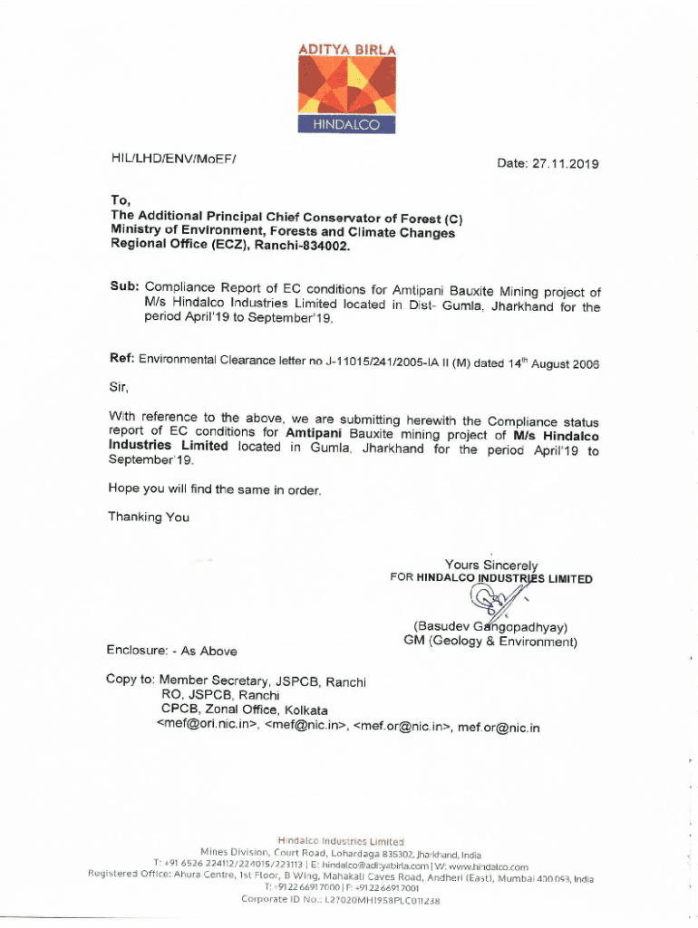 Compliance of conditions laid down in Environmental Clearance ARTISANS BAUXITE MINES (190.95 Ha) Period: April19 September19 MEF Environment Clearance ref: No J 11015/241/2005IA.II (M) dated 14 Aug06Sl.