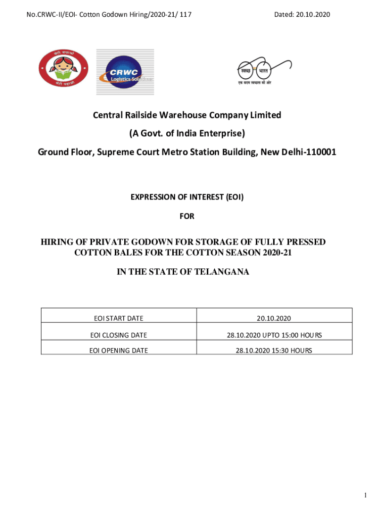 Get the free No. CRWC-II/EOI- Cotton Godown Hiring/2020-21/1294 Dated