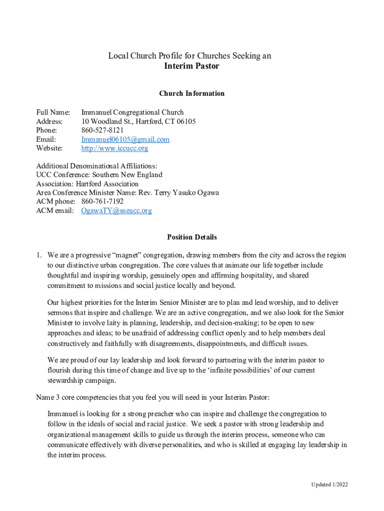 Local Church Profile for Churches Seeking an Interim Pastor Church Information Full Name: Address: Phone: Email: Website:Immanuel Congregational Church 10 Woodland St., Hartford, CT 06105 8605278121