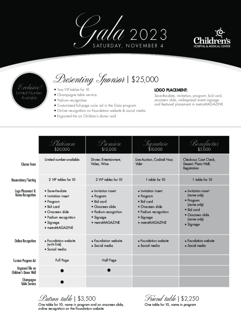 Gala 2023Exclusive! Limited Number Available SAT U R D A, N O V E M B E R 4Presenting Sponsor | $25,000 Two VIP tables for 10 Champagne table service Podium recognition Customized full page color