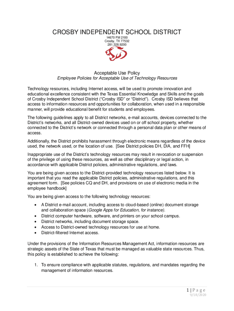CROSBY INDEPENDENT SCHOOL DISTRICT 14670 FM 2100 Crosby, TX 77532 281.328.9200Acceptable Use Policy Employee Policies for Acceptable Use of Technology Resources, including Internet access, will be