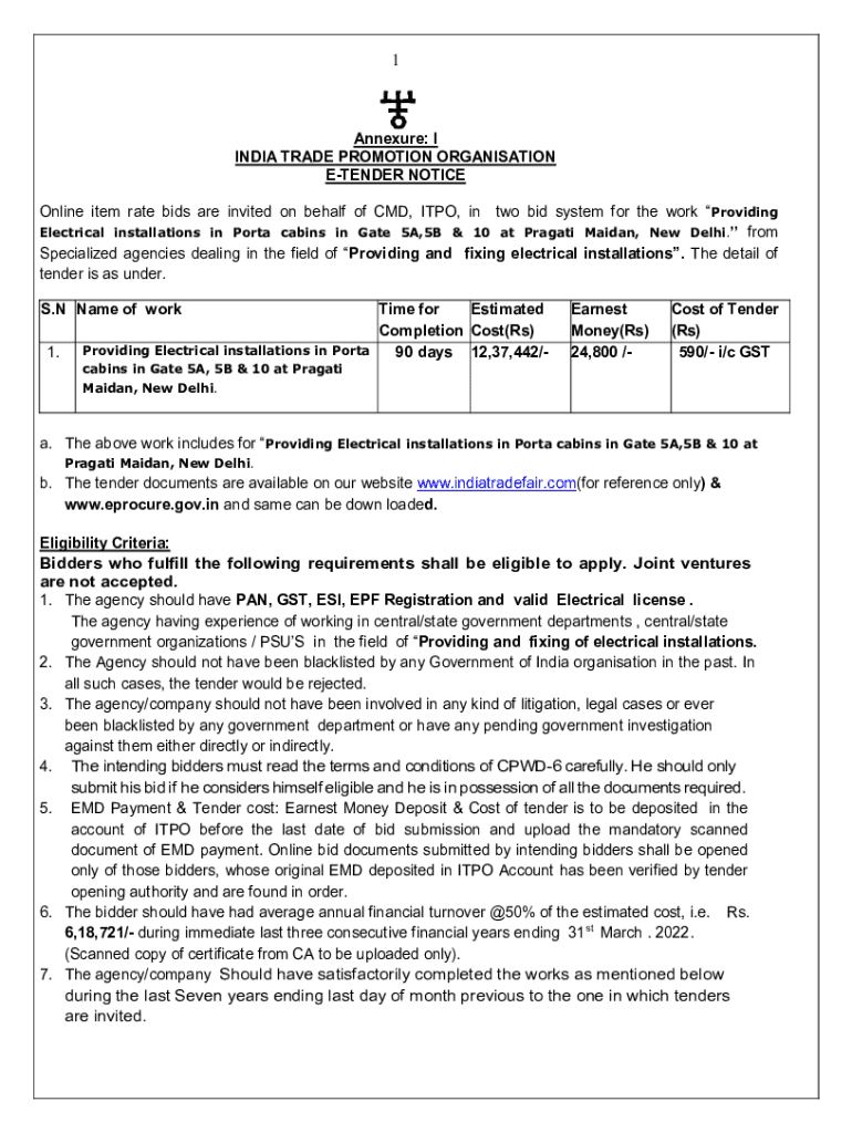 Electrical installations in Port cabins in Gate 5A,5B & 10 at Pragmatic Maidan, New Delhi. From