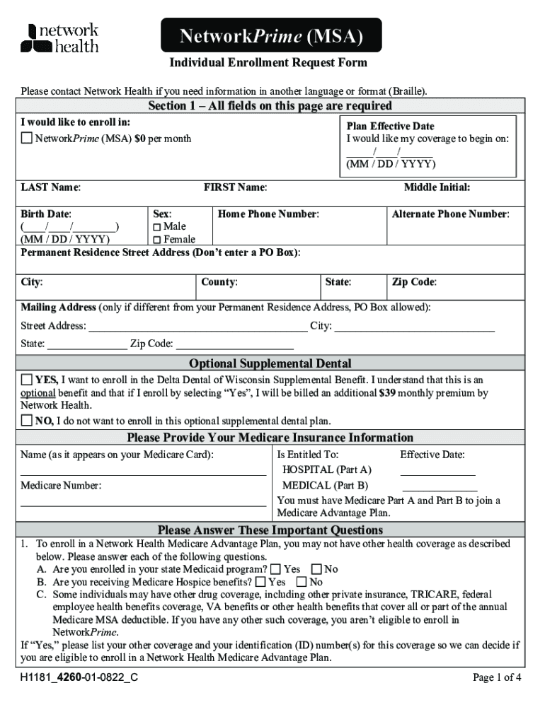 NetworkPrime (MSA) Individual Enrollment Request Form Please contact Network Health if you need information in another language or format (Braille). Section 1 All fields on this page are required