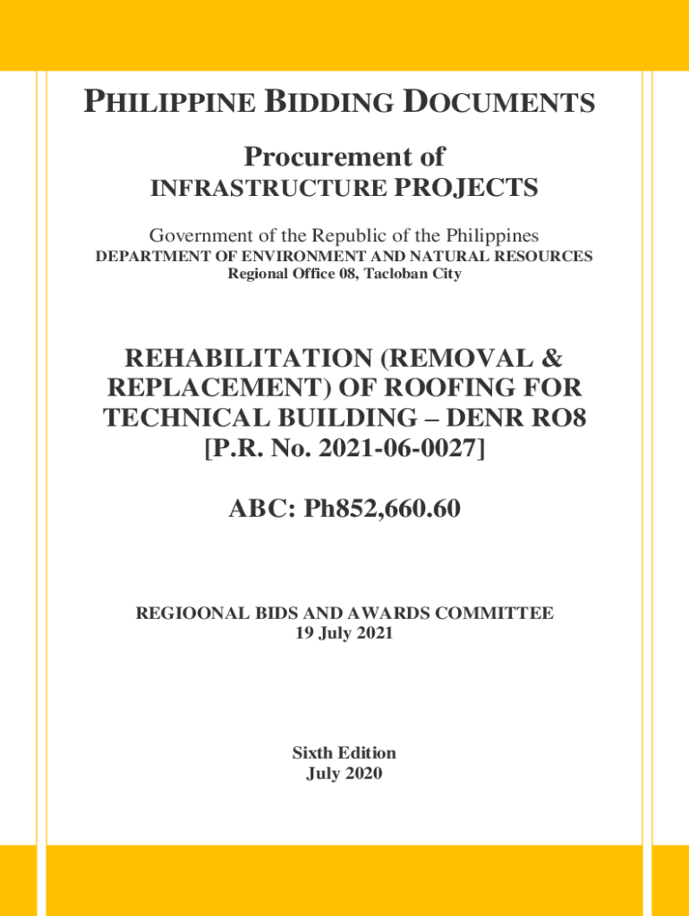 PHILIPPINE BIDDING DOCUMENTS Procurement of INFRASTRUCTURE PROJECTS Government of the Republic of the Philippines DEPARTMENT OF ENVIRONMENT AND NATURAL RESOURCES Regional Office 08, Taliban CityREHABILITATION