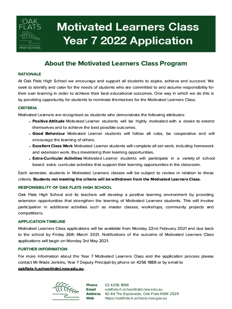 Motivated Learners Class Year 7 2022 Application About the Motivated Learners Class Program RATIONALE At Oak Flats High School we encourage and support all students to aspire, achieve and succeed.