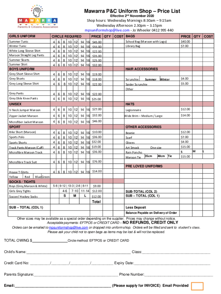 Malaria P&C Uniform Shop Price List Effective 2nd November 2020Shop hours: Wednesday Mornings 8:30am 9:15am Wednesday Afternoon 2.30pm 3.15pm mpsuniformshop@live.com Jo Wheeler 0412 995 440 GIRLS