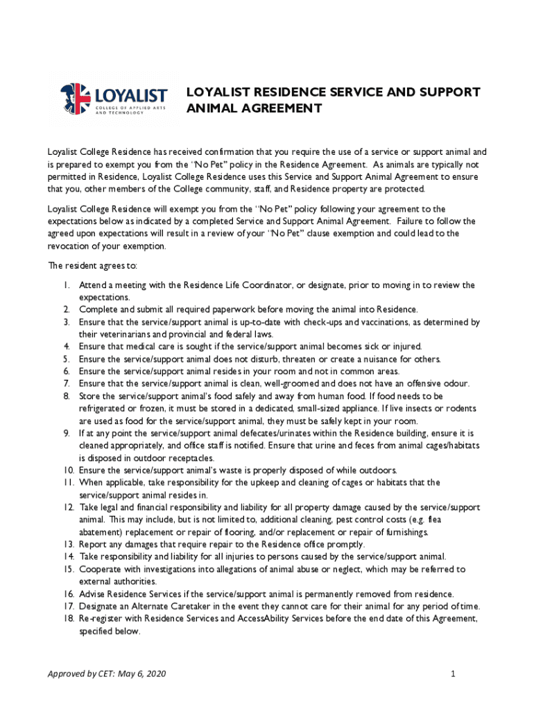LOYALIST RESIDENCE SERVICE AND SUPPORT ANIMAL AGREEMENT Loyalist College Residence has received confirmation that you require the use of a service or support animal and is prepared to exempt you from