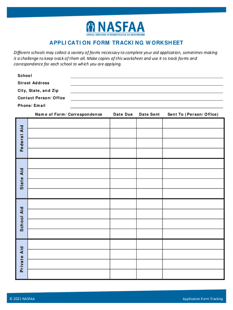 APPLICATION FORM TRACKING WORKSHEET Different schools may collect a variety of forms necessary to complete your aid application, sometimes making it a challenge to keep track of them all. Make copies