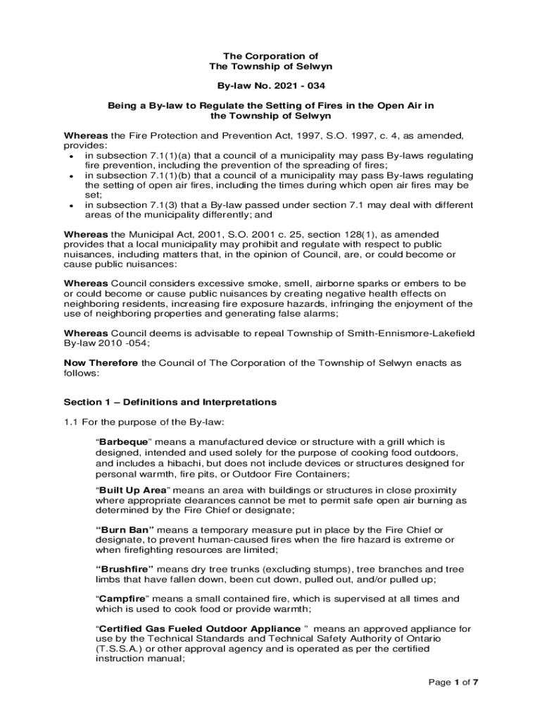 The Corporation of The Township of Selwyn Bylaw No. 2021 034 Being a Bylaw to Regulate the Setting of Fires in the Open Air in the Township of Selwyn Whereas the Fire Protection and Prevention Act,