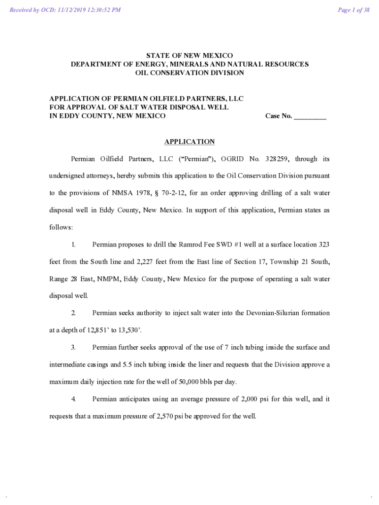 Received by OCD: 11/12/2019 12:30:52 PM Page 1 of 38STATE OF NEW MEXICO DEPARTMENT OF ENERGY, MINERALS AND NATURAL RESOURCES OIL CONSERVATION DIVISION APPLICATION OF PERMIAN OILFIELD PARTNERS, LLC