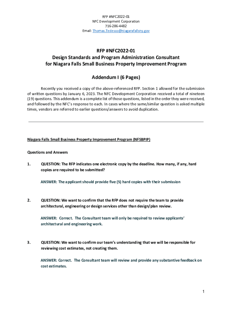 RFP #NFC202201 NFC Development Corporation 7162864482 Email: Thomas.Tedesco@niagarafallsny.govRFP #NFC202201 Design Standards and Program Administration Consultant for Niagara Falls Small Business