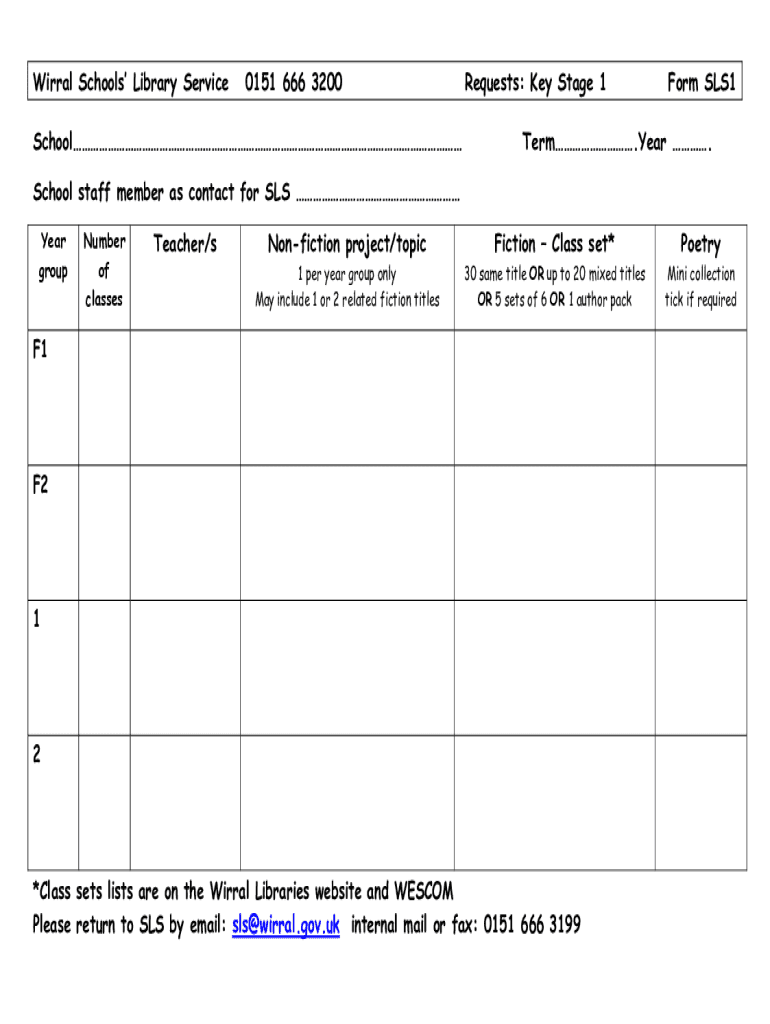 Viral Schools Library Service0151 666 3200SchoolRequests: Key Stage 1Form SLS1Term. Year. School staff member as contact for SLS Year outnumber of classesTeacher/nonfiction project/typification Class