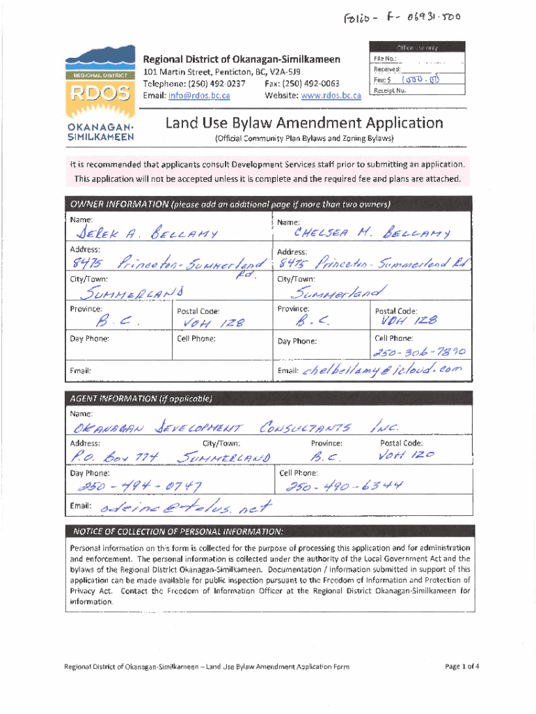 Office use only E G IO N A L D IS T R Regional District of OkanaganSimilkameenFile No.:101 Martin Street, Mention, BC, V2A5J9 Telephone: (250) 4920237 Fax: (250) 4920063 Email: info@rdos.bc.ca Website: