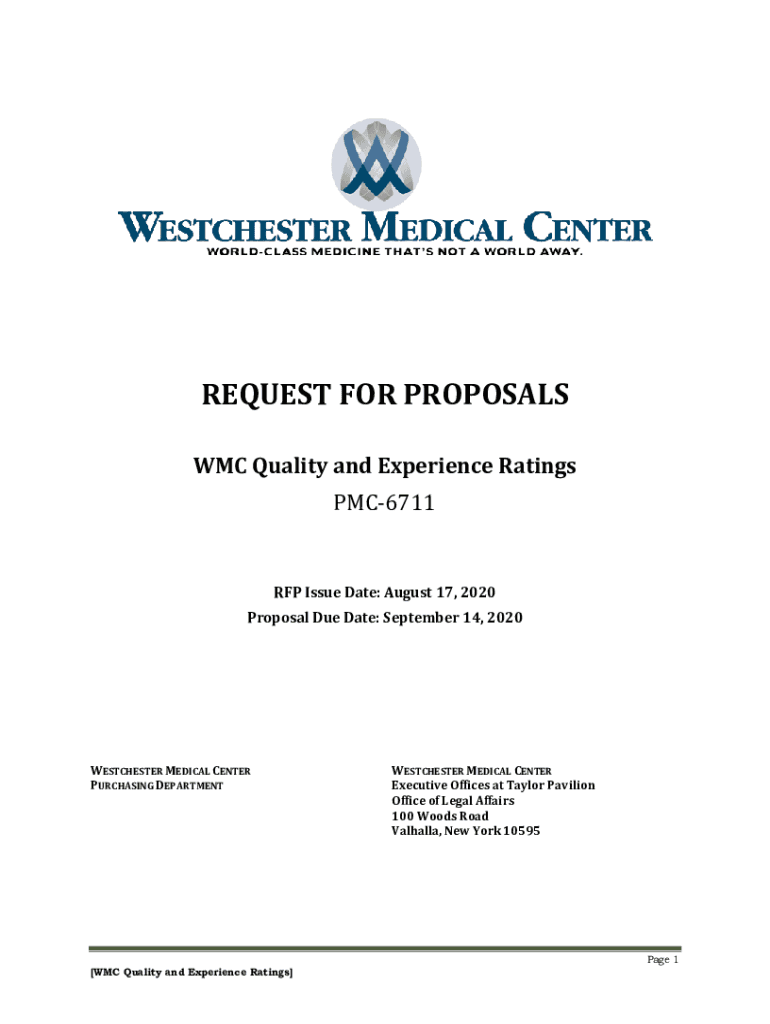 REQUEST FOR PROPOSALS BMC Quality and Experience Ratings PMC6711 RFP Issue Date: August 17, 2020, Proposal Due Date: September 14, 2020WESTCHESTER MEDICAL CENTER PURCHASING DEPARTMENT[BMC Quality