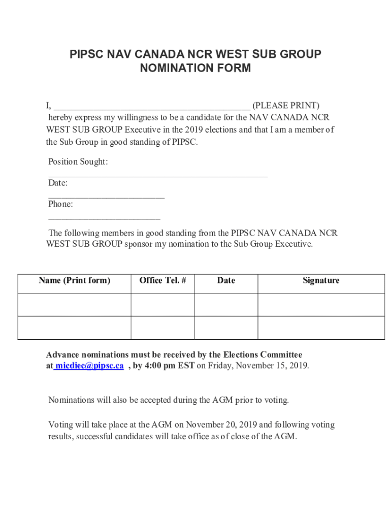 PIPS NAV CANADA NCR WEST SUB GROUP NOMINATION FORM I, ___ (PLEASE PRINT) hereby express my willingness to be a candidate for the NAV CANADA NCR WEST SUB GROUP Executive in the 2019 elections and that