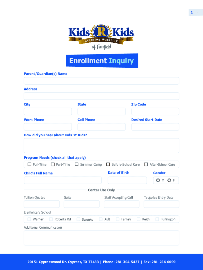 Parent/Guardian(s) NameAddressCityStateZip Bodywork Photocell PhoneDesired Start Date did you hear about Kids R Kids? Program Needs (check all that apply)