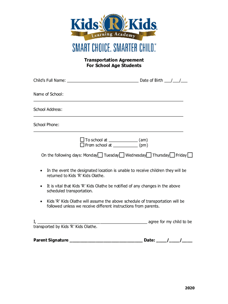 Transportation Agreement For School Age Students Child's Full Name: ___ Date of Birth ___/___/___ Name of School: ___ School Address: ___ School Phone: ___ To school at ___ (am) From school at ___