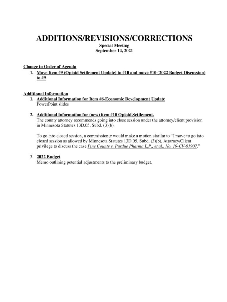 ADDITIONS/REVISIONS/CORRECTIONS Special Meeting September 14, 2021Change in Order of Agenda 1. Move Item #9 (Opioid Settlement Update) to #10 and move #10 (2022 Budget Discussion) to #9Additional