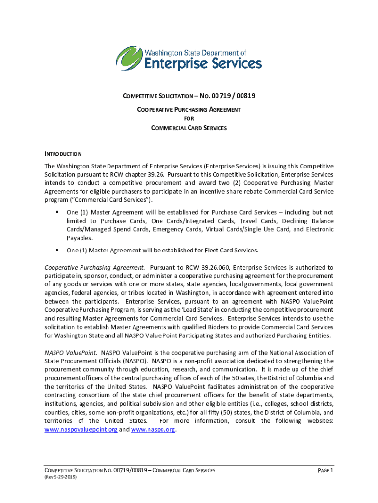 COMPETITIVE SOLICITATION NO. 00719 / 00819 COOPERATIVE PURCHASING AGREEMENT NONCOMMERCIAL CARD SERVICES INTRODUCTION The Washington State Department of Enterprise Services (Enterprise Services) is