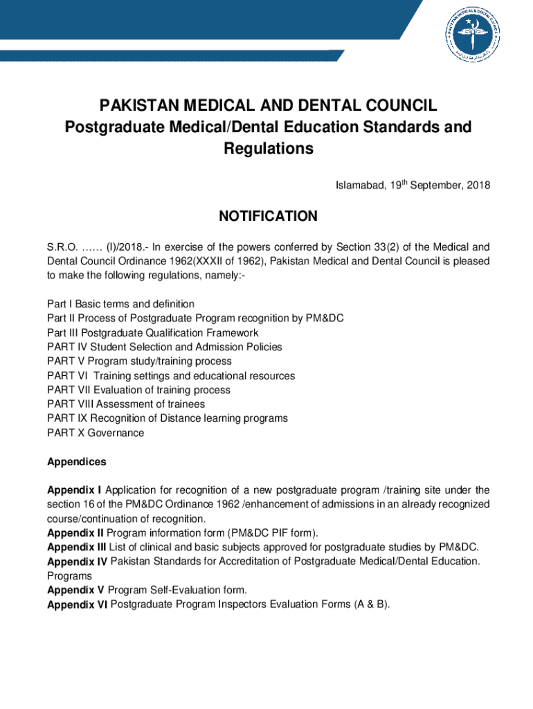 PAKISTAN MEDICAL AND DENTAL COUNCIL Postgraduate Medical/Dental Education Standards and Regulations Islamabad, 19th September, 2018NOTIFICATION S.R.O. (I)/2018. In exercise of the powers conferred