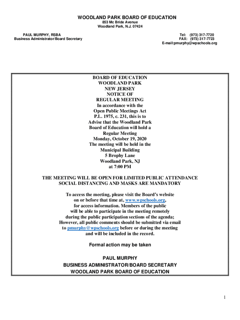 WOODLAND PARK BOARD OF EDUCATION 853 MC Bride Avenue Woodland Park, N.J. 07424 PAUL MURPHY, RSA Business Administrator/Board Secretary: (973) 3177720 FAX: (973) 3177723 Email:pmurphy@wpschools.onboard