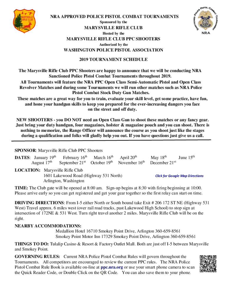 NRA APPROVED POLICE PISTOL COMBAT TOURNAMENTS Sponsored by Marysville RIFLE CLUB Hosted by theNRAMARYSVILLE RIFLE CLUB PPC SHOOTERS Authorized by Washington POLICE PISTOL ASSOCIATION 2019 TOURNAMENT