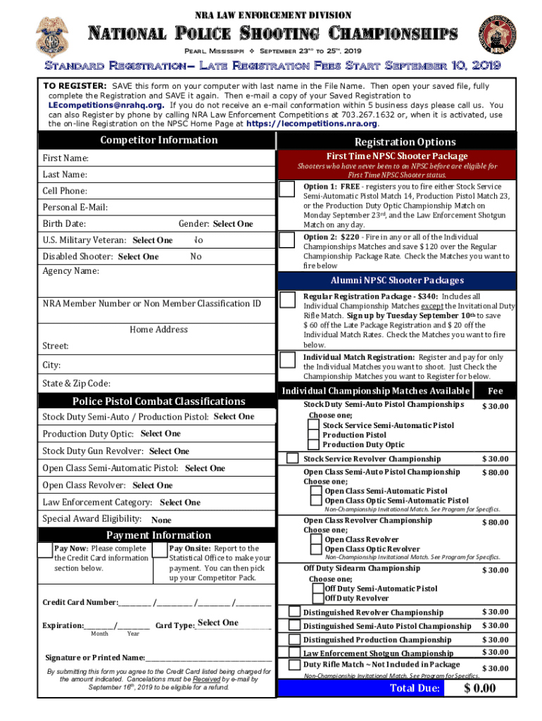 NRA Law Enforcement DivisionNational POLICE Shooting championships Pearl, Mississippi September 23rd to 25th, 2019Standard Registration Late Registration Fees Start September 10, 2019, TO REGISTER:
