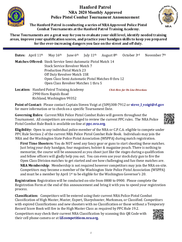 Hanford Patrol NRA 2020 Monthly Approved Police Pistol Combat Tournament Announcement The Hanford Patrol is conducting a series of NRA Approved Police Pistol Combat Tournaments at the Hanford Patrol
