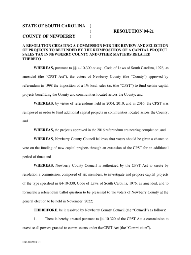 STATE OF SOUTH CAROLINA COUNTY OF NEWBERRY)))RESOLUTION 0421A RESOLUTION CREATING A COMMISSION FOR THE REVIEW AND SELECTION OF PROJECTS TO BE FUNDED BY THE IMPOSITION OF A CAPITAL PROJECT SALES TAX
