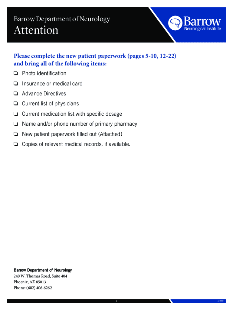 Barrow Department of NeurologyAttentionPlease complete the new patient paperwork (pages 510, 1222) and bring all the following items: Photo identification Insurance or medical card Advance Directives