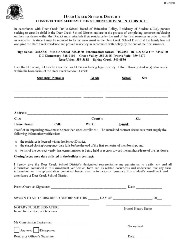 03/2020DEER CREEK SCHOOL DISTRICTCONSTRUCTION AFFIDAVIT FOR STUDENTS MOVING INTO DISTRICT In accordance with Deer Creek Public School Board of Education Policy, Residency of Student (JCA), parents