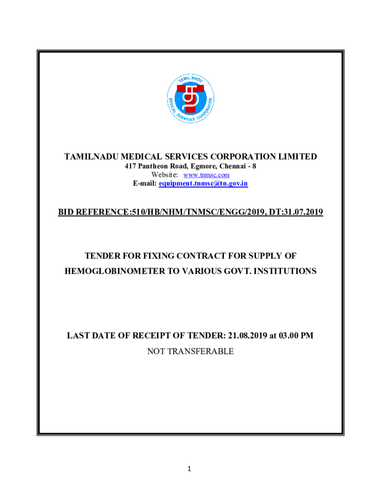 Tamil Nadu MEDICAL SERVICES CORPORATION LIMITED 417 Pantheon Road, Elmore, Chennai 8 Website: www.tnmsc.com Email: equipment.tnmsc@tn.gov.inBID REFERENCE:510/HE/NHS/TN MSC/EGG/2019, DT:31.07.2019TENDER