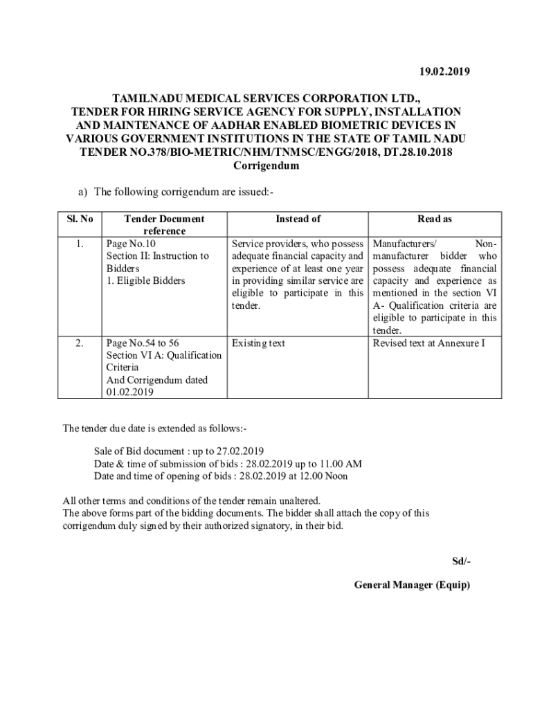 19.02.2019 Tamil Nadu MEDICAL SERVICES CORPORATION LTD., TENDER FOR HIRING SERVICE AGENCY FOR SUPPLY, INSTALLATION AND MAINTENANCE OF AADHAAR ENABLED BIOMETRIC DEVICES IN VARIOUS GOVERNMENT INSTITUTIONS