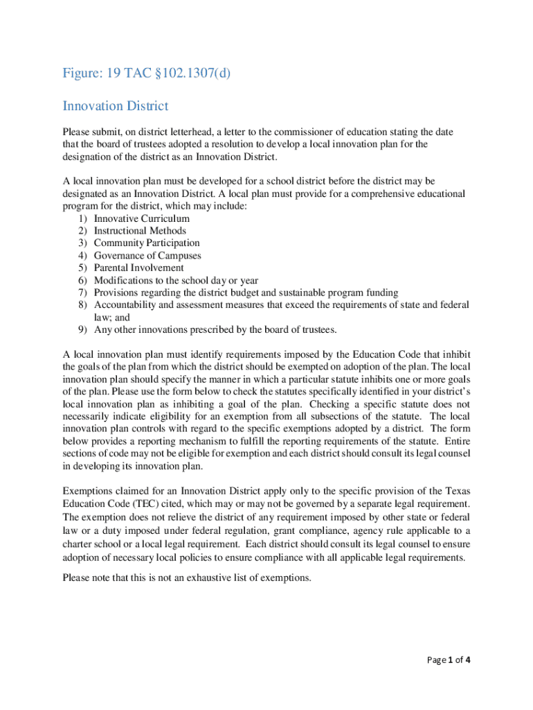 Figure: 19 TAC 102.1307(d) Innovation District Please submit, on district letterhead, a letter to the commissioner of education stating the date that the board of trustees adopted a resolution to