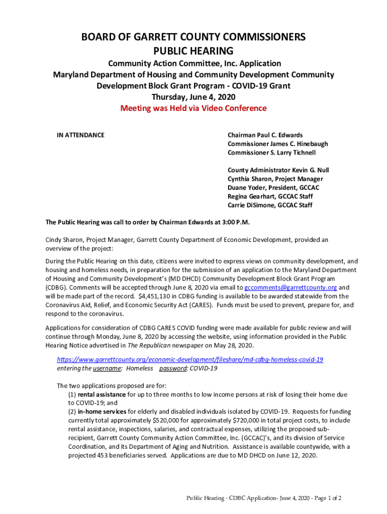 BOARD OF GARRETT COUNTY COMMISSIONERS PUBLIC HEARING Community Action Committee, Inc. Application Maryland Department of Housing and Community Development Block Grant Program COVID-19 Grant Thursday,
