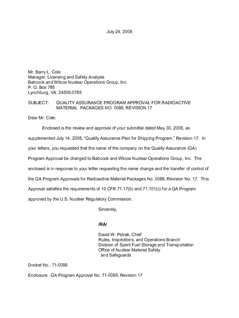 July 24, 2008Mr. Barry L. Cole Manager, Licensing and Safety Analysis Babcock and Wilcox Nuclear Operations Group, Inc. P. O. Box 785 Lynchburg, VA 245050785 SUBJECT:QUALITY ASSURANCE PROGRAM APPROVAL
