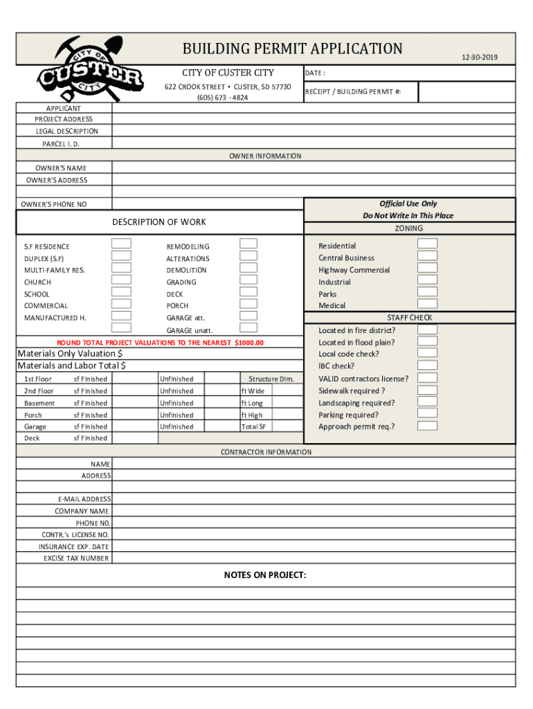 Get the free BUILDING PERMIT APPLICATION - Custer City