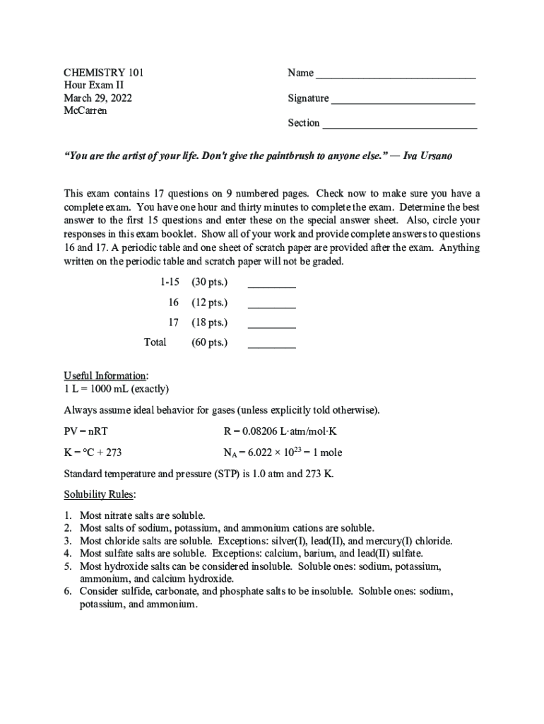 CHEMISTRY 101 Hour Exam II March 29, 2022, McCarrenName ___ Signature ___ Section ___You are the artist of your life. Don\'t give the paintbrush to anyone else. Iva Ursa no This exam contains 17 questions