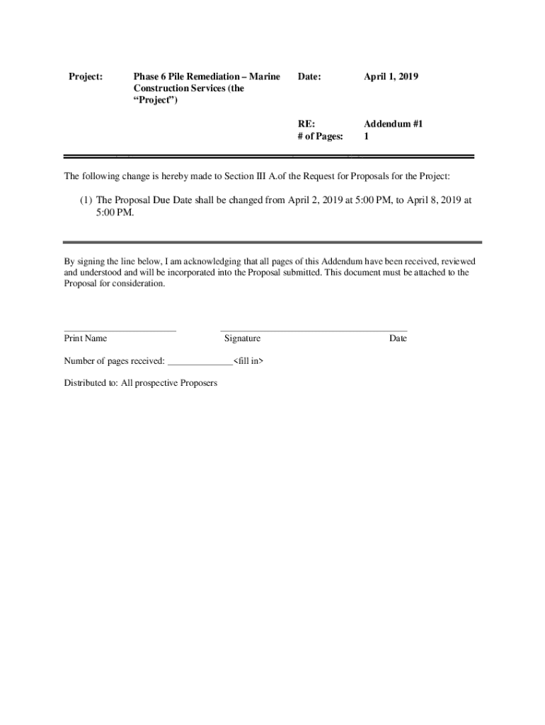 Project:Phase 6 Pile Remediation Marine Construction Services (the Project)Date:April 1, 2019RE: # of Pages:Addendum #1 1The following change is hereby made to Section III A.of the Request for Proposals