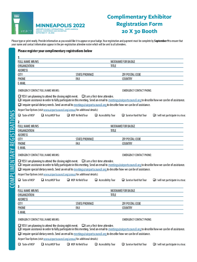 Complimentary Exhibitor Registration Form 20 × 30 Booth Please type or print neatly. Provide information as you would like it to appear on your badge. Your registration and payment must be complete