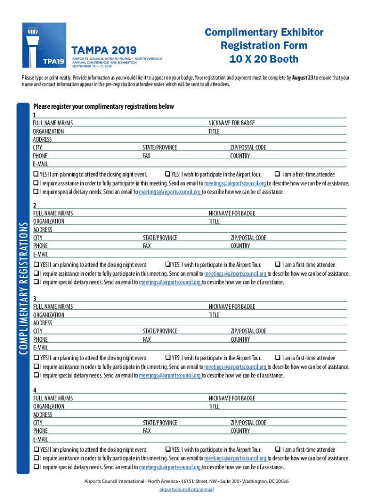 AIRPORTS COUNCIL INTERNATIONAL NORTH AMERICA ANNUAL CONFERENCE AND EXHIBITION SEPTEMBER 15 17, 2019Complimentary Exhibitor Registration Form 10 × 20 BoothPlease type or print neatly. Provide information