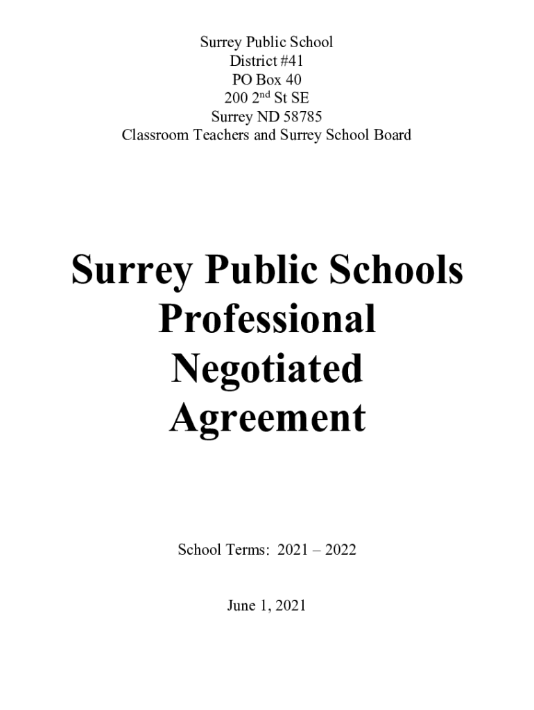 Surrey Public School District #41 PO Box 40 200 2nd St SE Surrey ND 58785 Classroom Teachers and Surrey School BoardSurrey Public Schools Professional Negotiated Agreement School Terms: 2021 2022