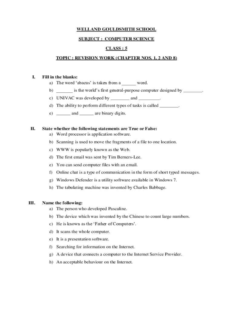 WELLAND GOLDSMITH SCHOOL SUBJECT : COMPUTER SCIENCE CLASS : 5 Topics : REVISION WORK (CHAPTER NOS. 1, 2 AND 8)I. Fill in the blanks: a) The word abacus is taken from a ___ word. b) ___ is the world's