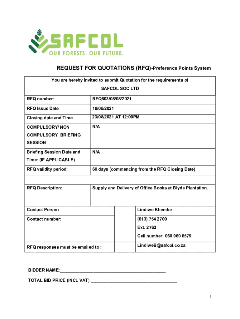 REQUEST FOR QUOTATIONS (RFQ)Preference Points System You are hereby invited to submit Quotation for the requirements of SAF COL SOC LTD RFQ number:RFQ803/08/08/2021RFQ Issue Date18/08/2021Closing