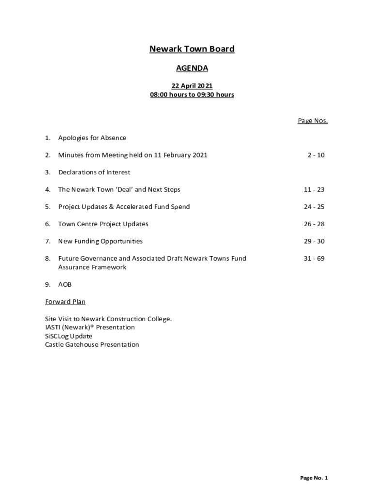 Newark Town Board AGENDA 22 April 2021 08:00 hours to 09:30 hours Page Nos. 1. Apologies for Absence2. Minutes from Meeting held on 11 February 20213. Declarations of Interest4. The Newark Town Deal
