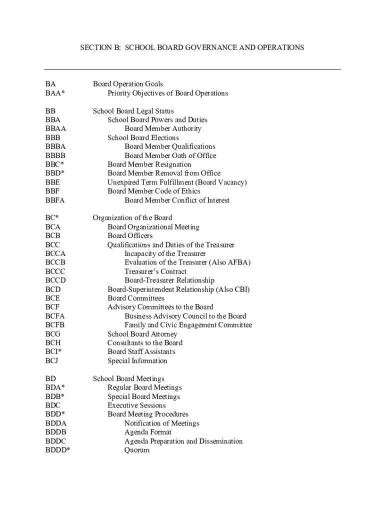 SECTION B: SCHOOL BOARD GOVERNANCE AND OPERATION SBA BAA×Board Operation Goals Priority Objectives of Board Operations BB BBA BAA BBB BBB BBB BBC* BBD* BBE BBF BBFASchool Board Legal Status School