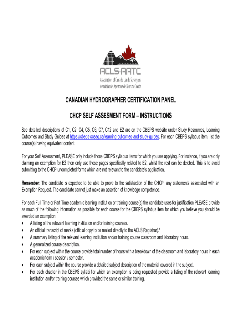 CANADIAN HYDROGRAPH CERTIFICATION PANEL CHIP SELF ASSESSMENT FORM INSTRUCTIONS See detailed descriptions of C1, C2, C4, C5, C6, C7, C12 and E2 are on the CEPS website under Study Resources, Learning